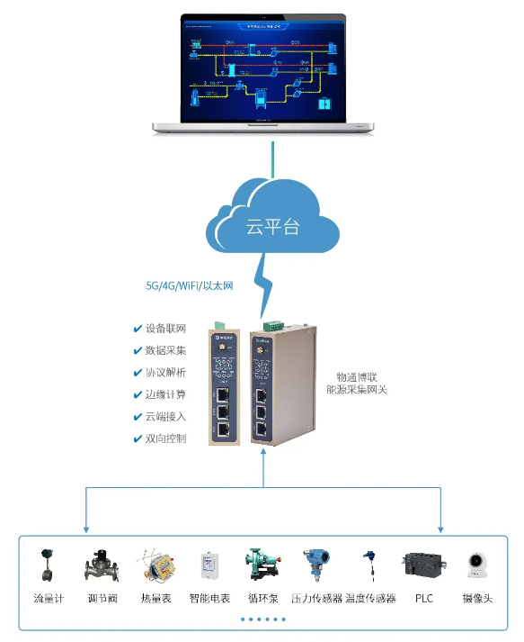 通過部署能源數(shù)采網(wǎng)關(guān),能夠?qū)崟r(shí)采集流量計(jì)、智能電表、熱量表、稱重儀器、循環(huán)泵、調(diào)節(jié)閥、溫度傳感器、壓力傳感器等設(shè)備,將供熱量、耗汽量、耗水量、耗電量、燃料消耗量、余熱利用量、溫度、壓力等數(shù)據(jù)對接到智慧供熱能源管理平臺中,從而將熱源、管網(wǎng)、中繼泵站、熱力站等納入統(tǒng)一的節(jié)能評價(jià)系統(tǒng)中,實(shí)現(xiàn)對能源的監(jiān)測、管理、統(tǒng)計(jì)與分析,助力提高能源利用效率與管理水平,實(shí)現(xiàn)節(jié)能、降本與增效的全面發(fā)展。