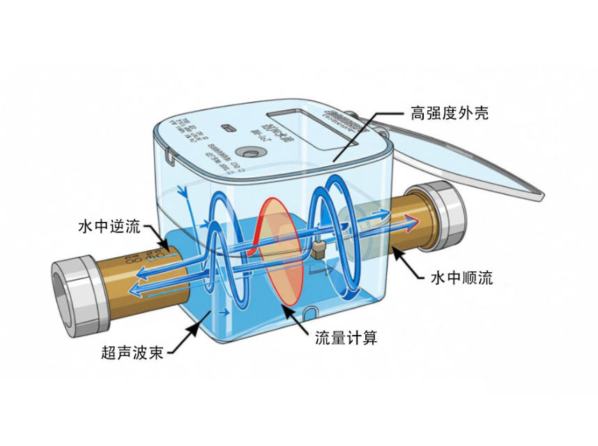 超聲波水表的核心技術(shù)原理是“時差法” ,即通過測量超聲波束在水中順流和逆流傳播的時間差來確定水流速度。